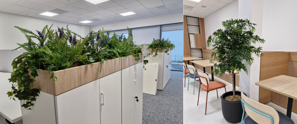 According to research; plants have a positive effect on Mood, Concentration and Productivity of staff in the work place; with obvious enhanced visual improvement and also reducing Sick Building Syndrome by purifying the air .